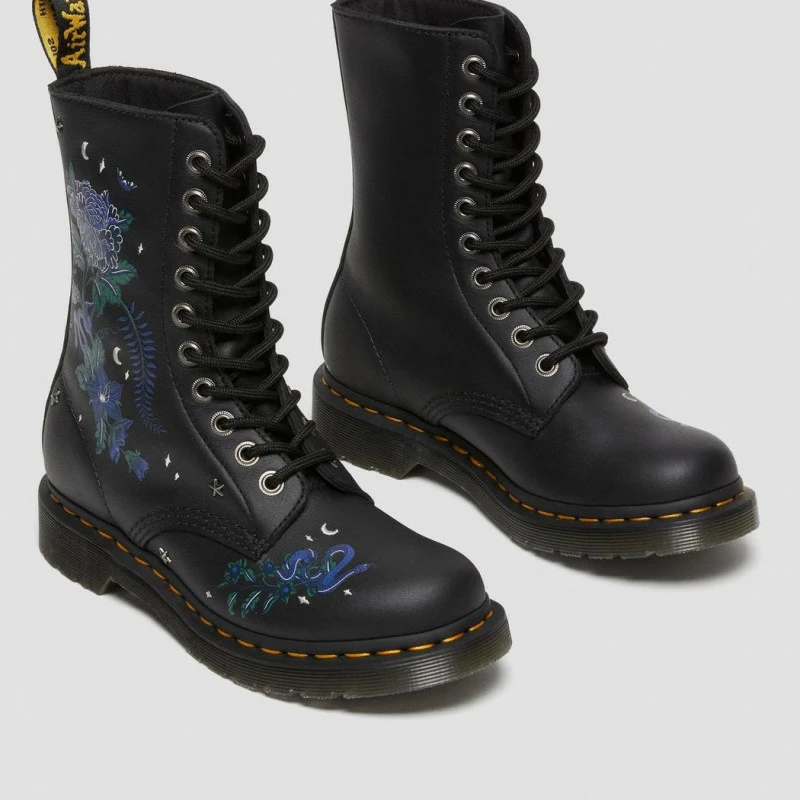 Cette botte 1490 à 10 œillets est ornée d’un imprimé floral avec un bord sombre et subverti. Rehaussé de lunes brodées et d’étoiles cloutées. Fabriqué à partir de cuir Sendal pleine fleur lisse. Monté sur une semelle à coussin d’air et maintenu fermement par des coutures Goodyear jaune. « Mon pied, ce Héros » aime la 1490 !