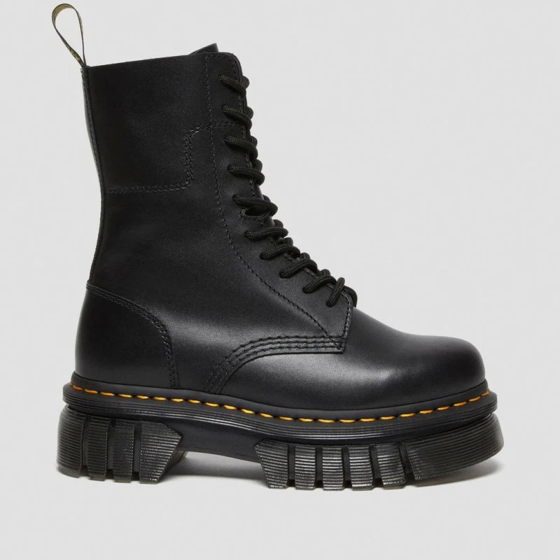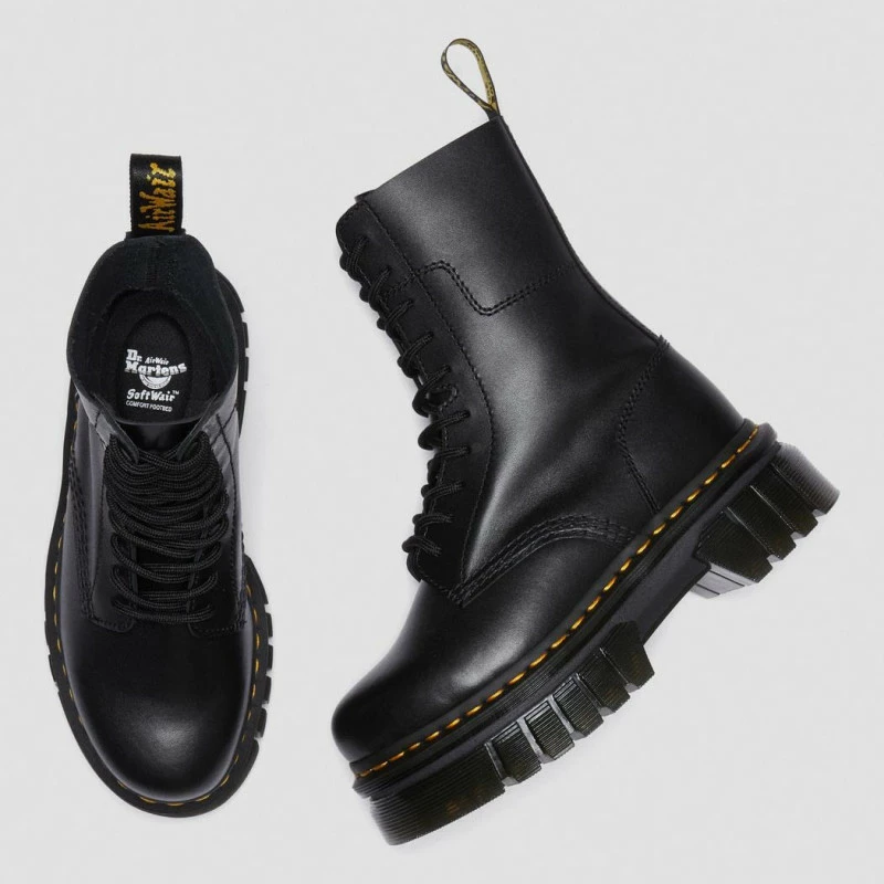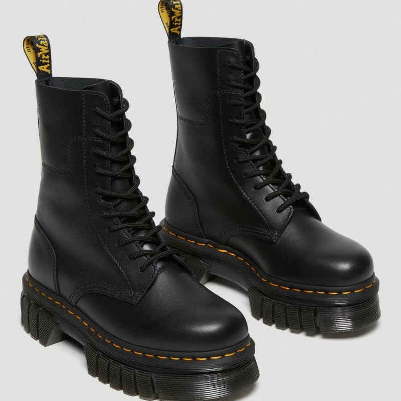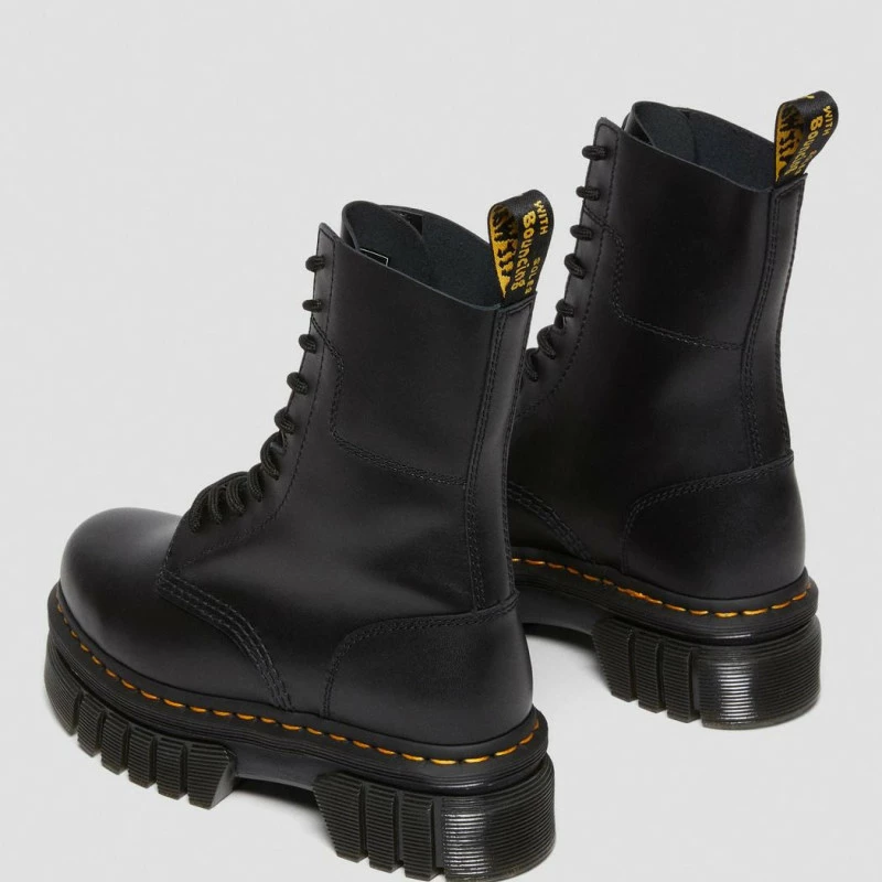 La semelle Quad Neoteric continue de briser les conventions. Cette semelle unique est composĂ©e de deux parties lĂ©gĂšres et prĂ©sente des crans exagĂ©rĂ©s ainsi qu’un profil imposant. Une semelle plateforme vertigineuse que vous pourrez porter au quotidien. Les nouvelles boots Audrick 10i vous feront passer Ă l’Ă©tape supĂ©rieure. Faites en cuir Nappa Lux, ces boots montantes sont dotĂ©es de trois rangĂ©es de surpiqĂ»res sur le dessus de la tige, de deux anneaux en cuir pour lacets et de lacets longs qui peuvent ĂȘtre enroulĂ©s autour du col pour un effet original. Les surpiqĂ»res jaunes et la languette Ă logo AirWair en font une crĂ©ation DM’s indĂ©niable. « Mon pied, ce HĂ©ros » aime la Doc Audrick !